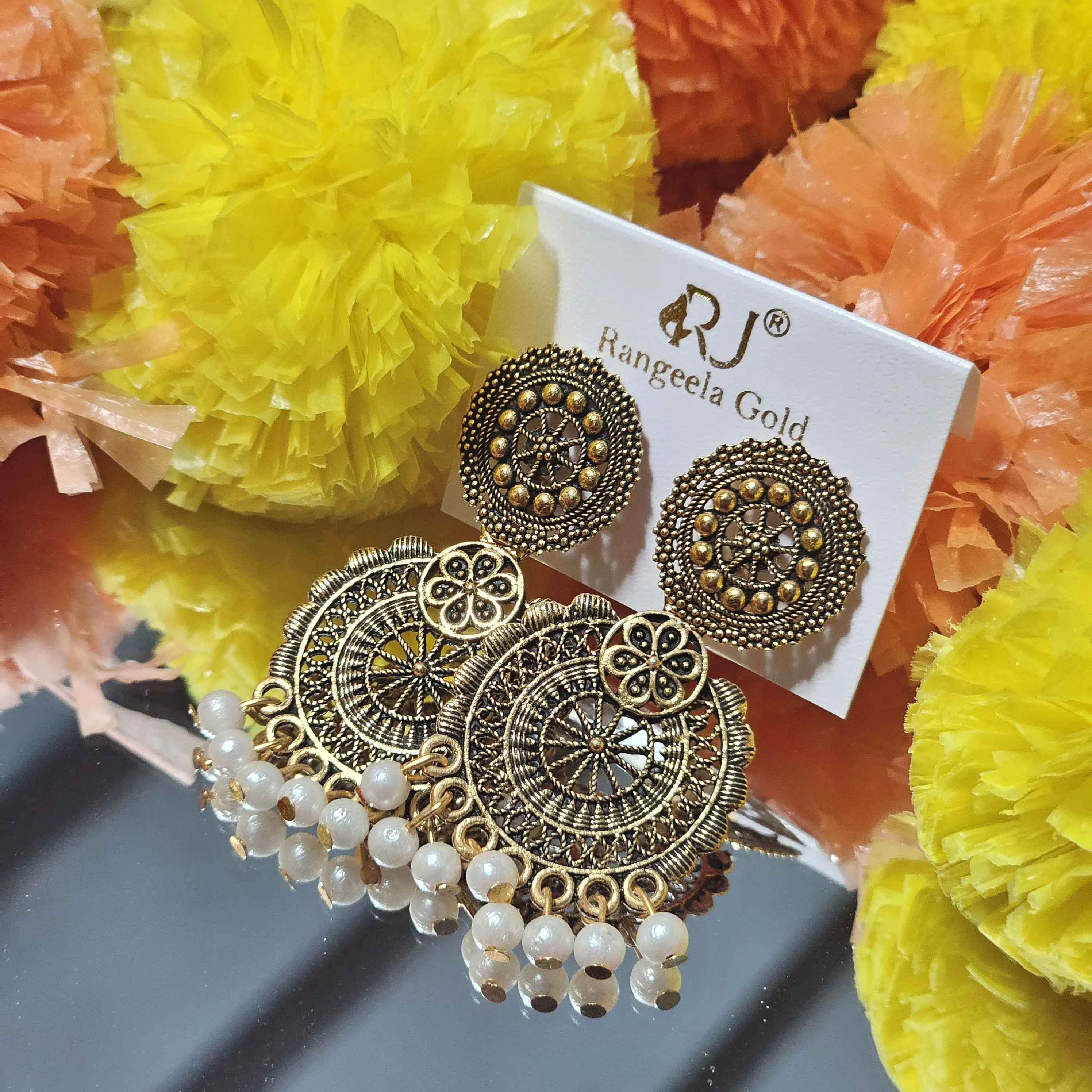 Add a touch of heritage elegance to your look with these Antique Circular Temple Earrings, beautifully crafted with intricate radial patterns and a rich antique gold finish. The earrings are enhanced with delicate pearl drop hangings that create graceful movement and a timeless South Indian appeal. Perfect for weddings, festivals, and traditional occasions, these earrings pair effortlessly with sarees and ethnic wear.