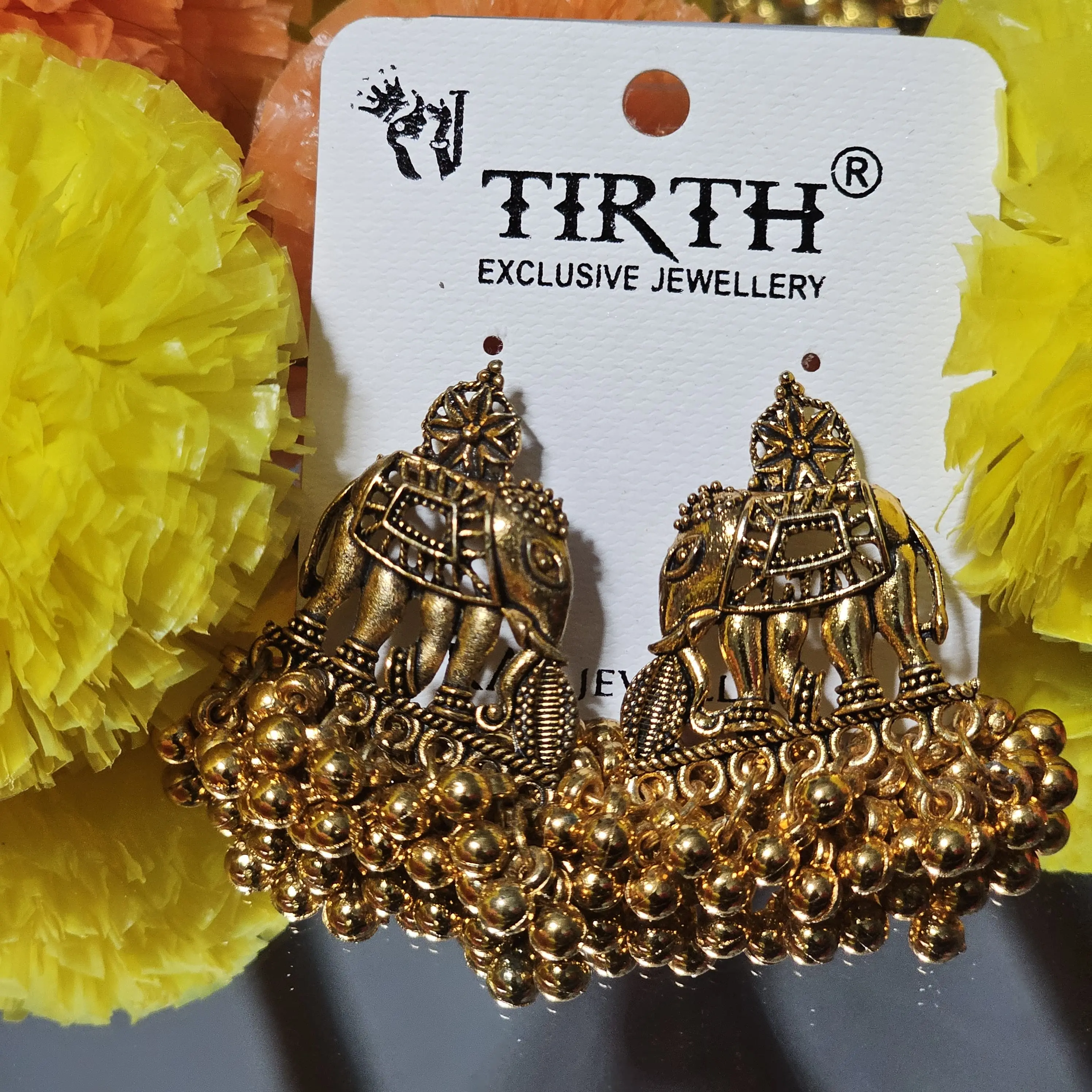 Celebrate timeless tradition with these Royal Elephant Motif Antique Gold Jhumka Earrings. Featuring intricately carved elephant designs symbolizing prosperity and strength, these earrings are finished in a rich antique gold tone and detailed with classic jhumka bead hangings. A perfect statement piece for weddings, temple visits, and festive occasions.
