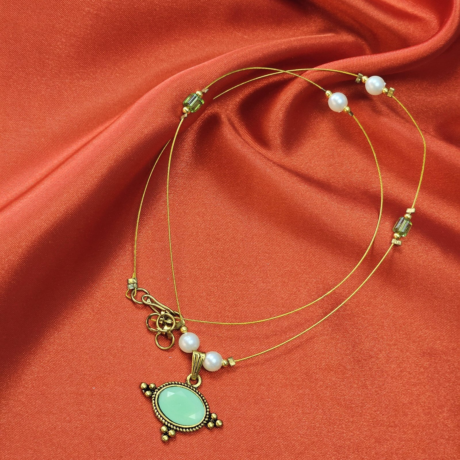 This lightweight necklace showcases a dual-layer gold chain paired with soft white pearls and sparkling green crystals, centered around an enchanting emerald-green stone pendant with antique gold detailing.