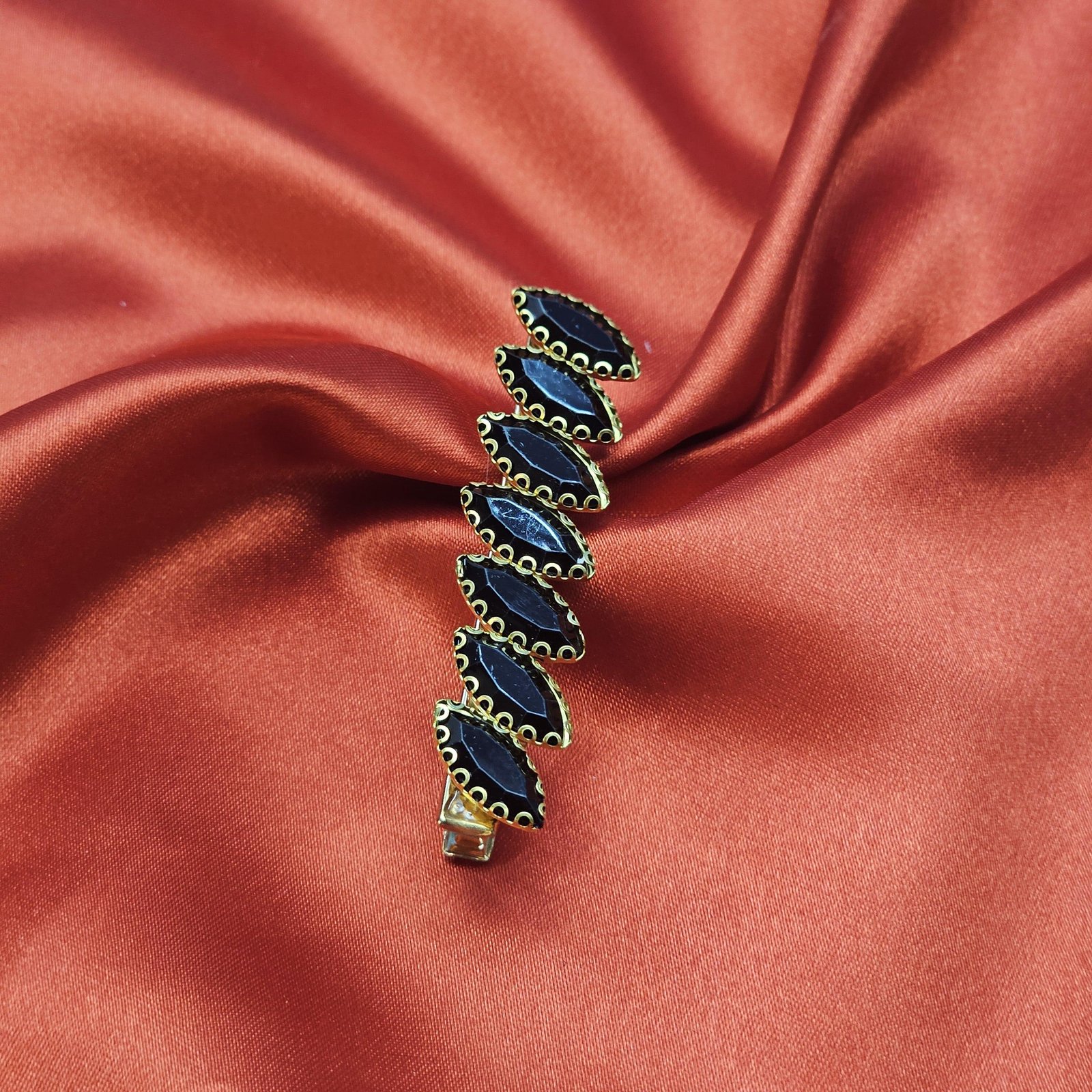 Command attention with this bold and sophisticated hair clip. This accessory features a sleek line of six rich black, marquise-cut stones (or navette cut) set horizontally within ornate, antique gold-tone bezels. The vertical arrangement of the stones creates an eye-catching, elongated design that adds a touch of dramatic elegance to any hairstyle. Perfect for making a chic statement at evening events, cocktail parties, or when you want a touch of sophisticated gothic glamour.