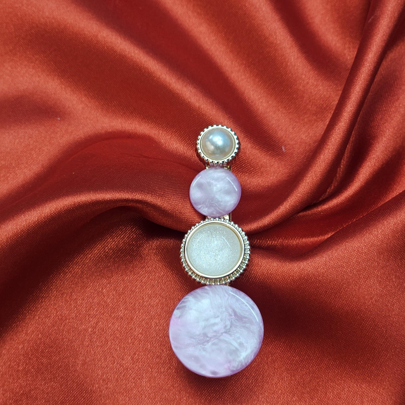 Infuse your look with soft, romantic charm using this beautiful layered hair clip. This elegant accessory features a vertical arrangement of four distinct elements: a small, lustrous faux pearl at the top, a medium lilac marbled stone, a sparkling white/glitter disc framed by a rhinestone halo, and a large marbled lilac and white cabochon at the base. The combination of pastel hues and varied textures in a polished gold-tone setting creates a feminine, eye-catching piece perfect for daytime events, bridal showers, or adding a soft touch to your everyday ensemble.