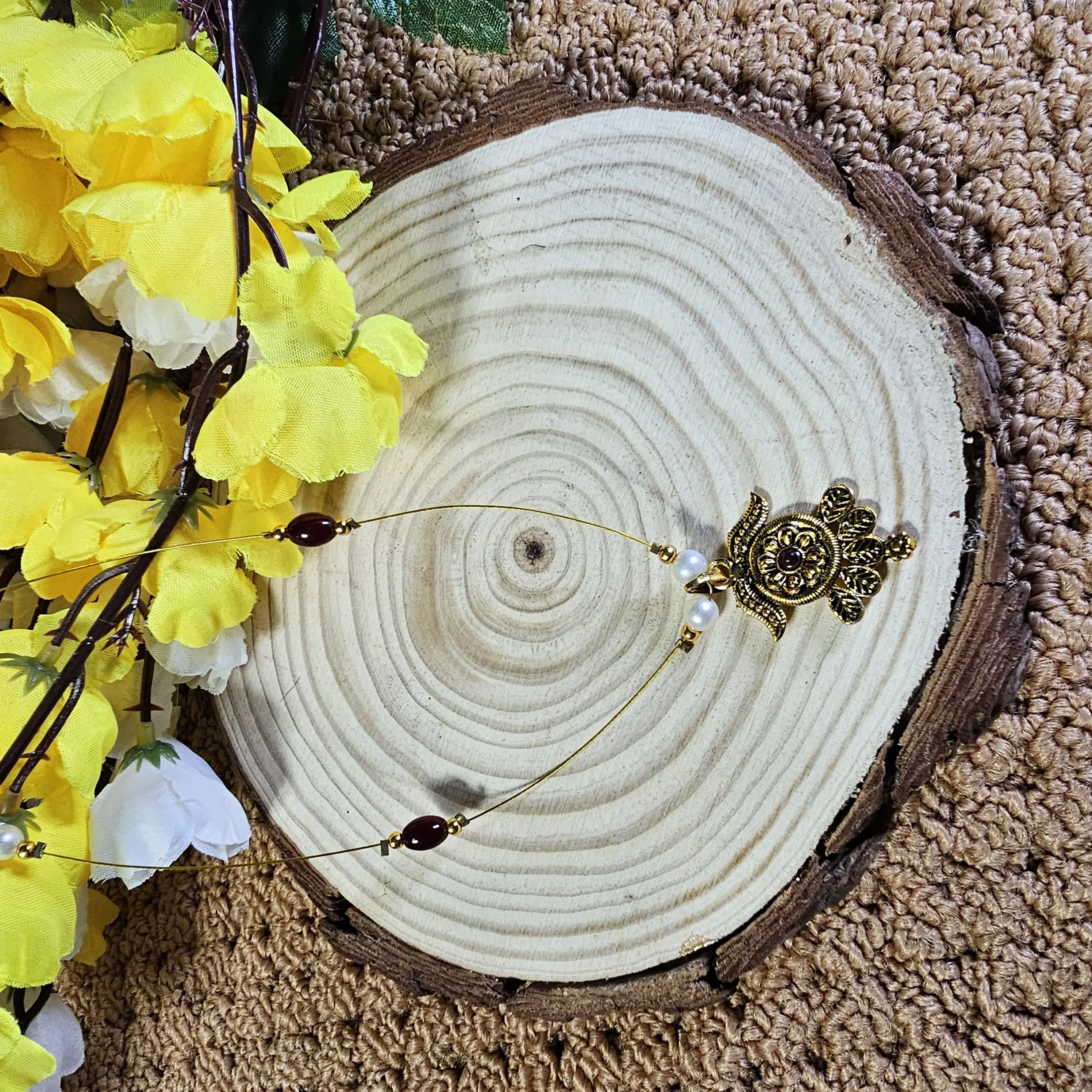 Bring divine elegance to your jewellery collection with the Antique Lakshmi Bloom Invisible Chain Pendant. Designed with a lightweight invisible chain, this pendant features a beautifully crafted Lakshmi-inspired floral motif in an antique gold finish, highlighted with a deep maroon stone and delicate pearl detailing.