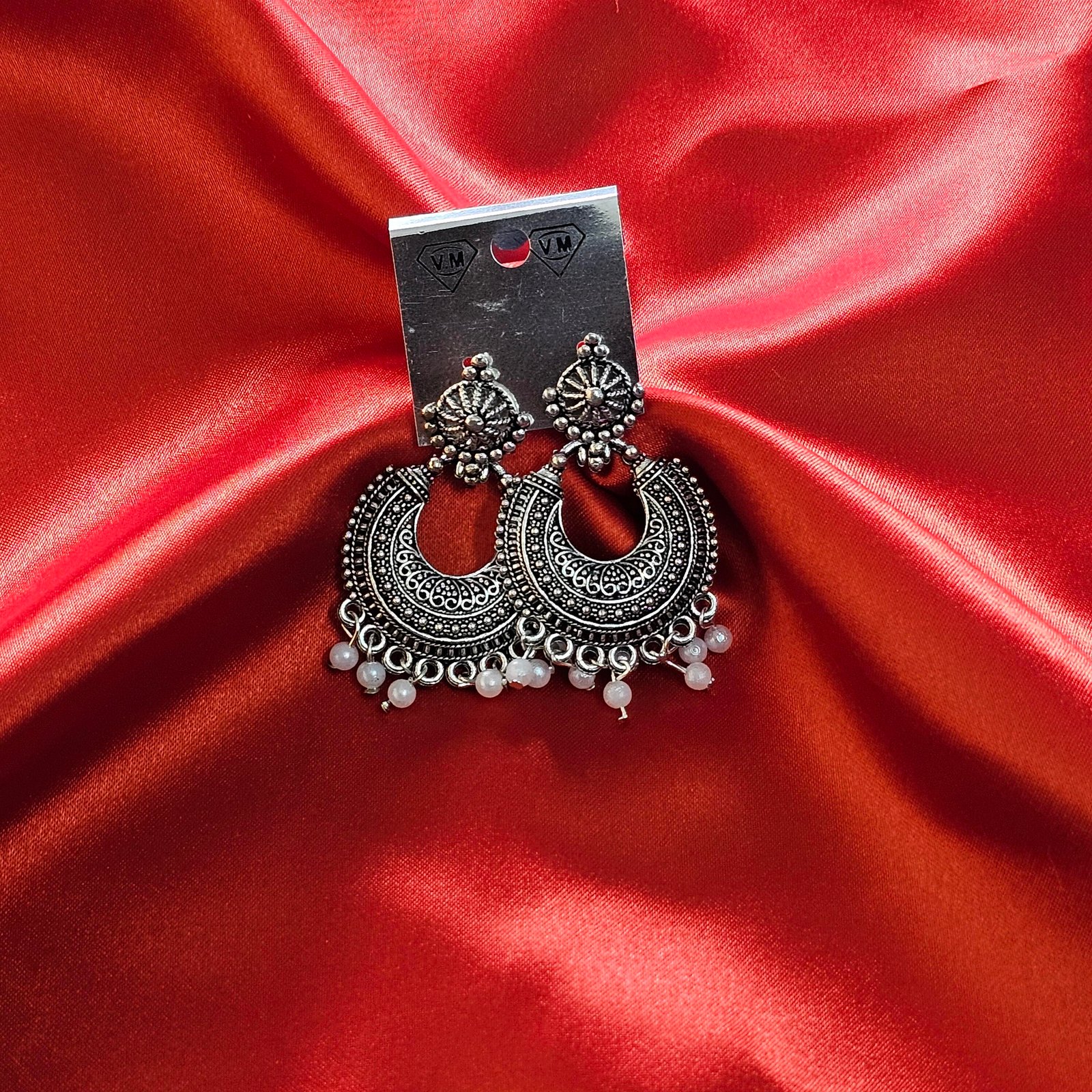 Elegant oxidized crescent jhumka earrings with pearl drops — a timeless beauty for your ethnic look.Add a royal touch to your festive and traditional outfits with these Oxidized Silver Crescent Pearl Jhumka Earrings.