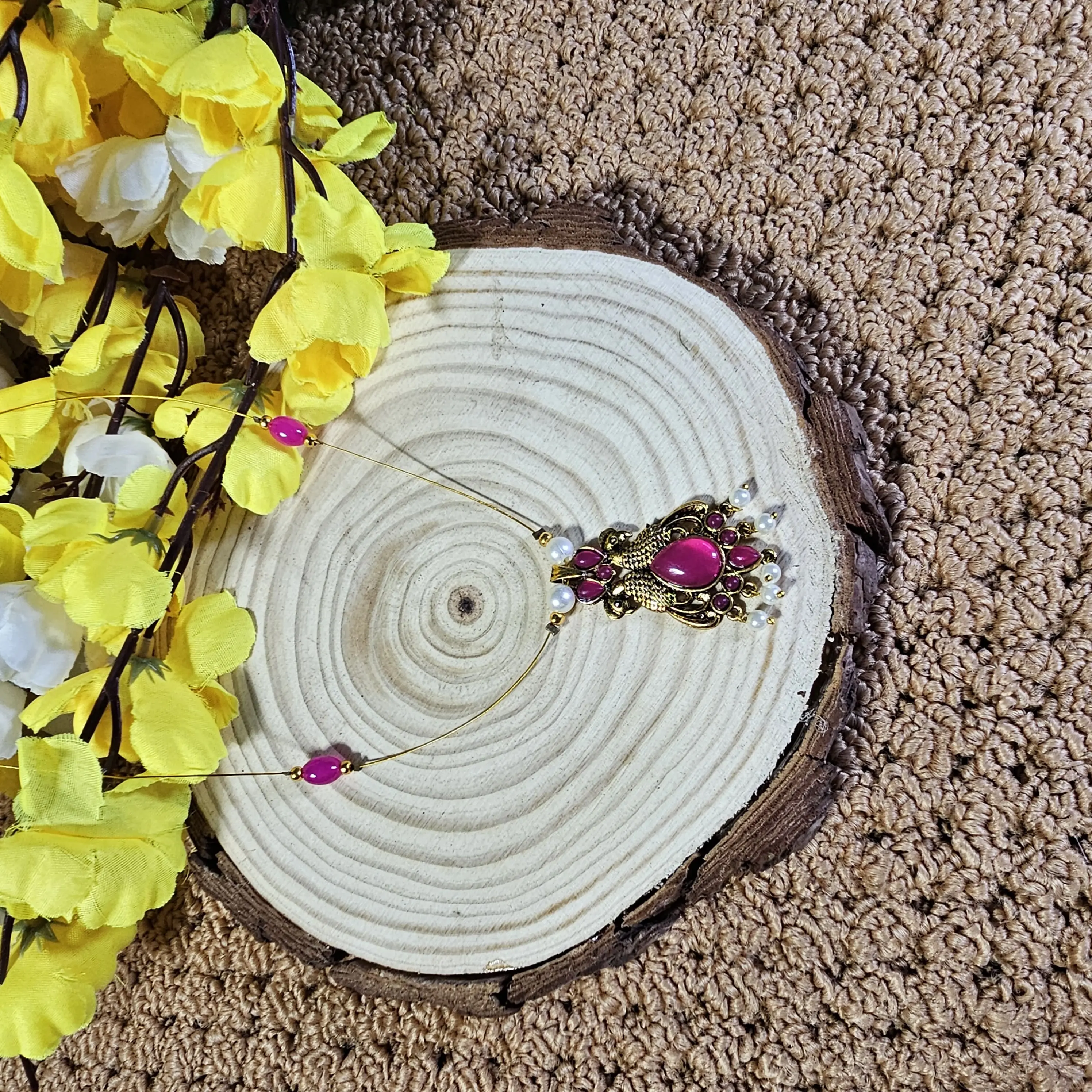Celebrate timeless tradition with the Peacock Grace Pink Stone Invisible Chain Pendant. This stunning pendant features an intricately designed peacock motif finished in antique gold, adorned with rich pink stones and delicate pearl accents that enhance its royal ethnic charm.