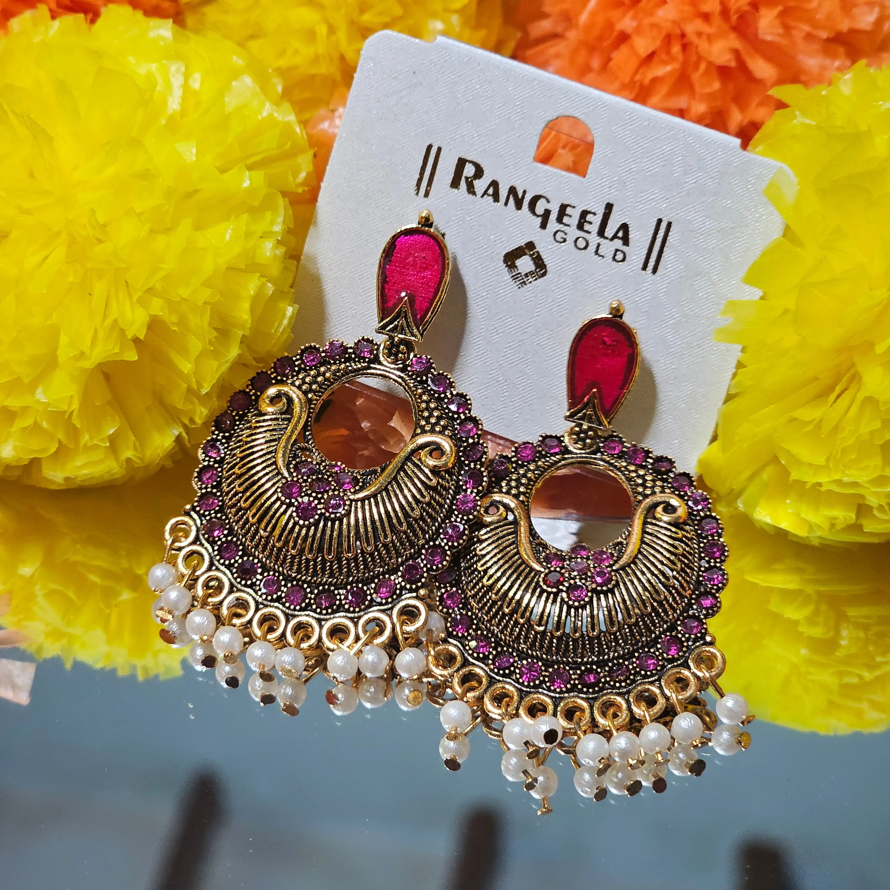Elevate your ethnic look with these stunning Pink Stone Chandbali Earrings, crafted with intricate gold-tone detailing and highlighted by vibrant pink stones. Finished with elegant pearl drops, this classic chandbali design brings royal charm and traditional grace—perfect for weddings, festivals, and special occasions.
