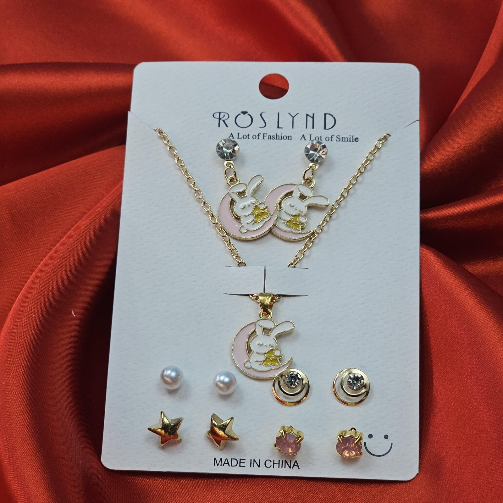 The necklace comes with a fine gold-toned chain and a matching pair of bunny-themed earrings, along with multiple stud options including stars, pearls, and crystal stones.