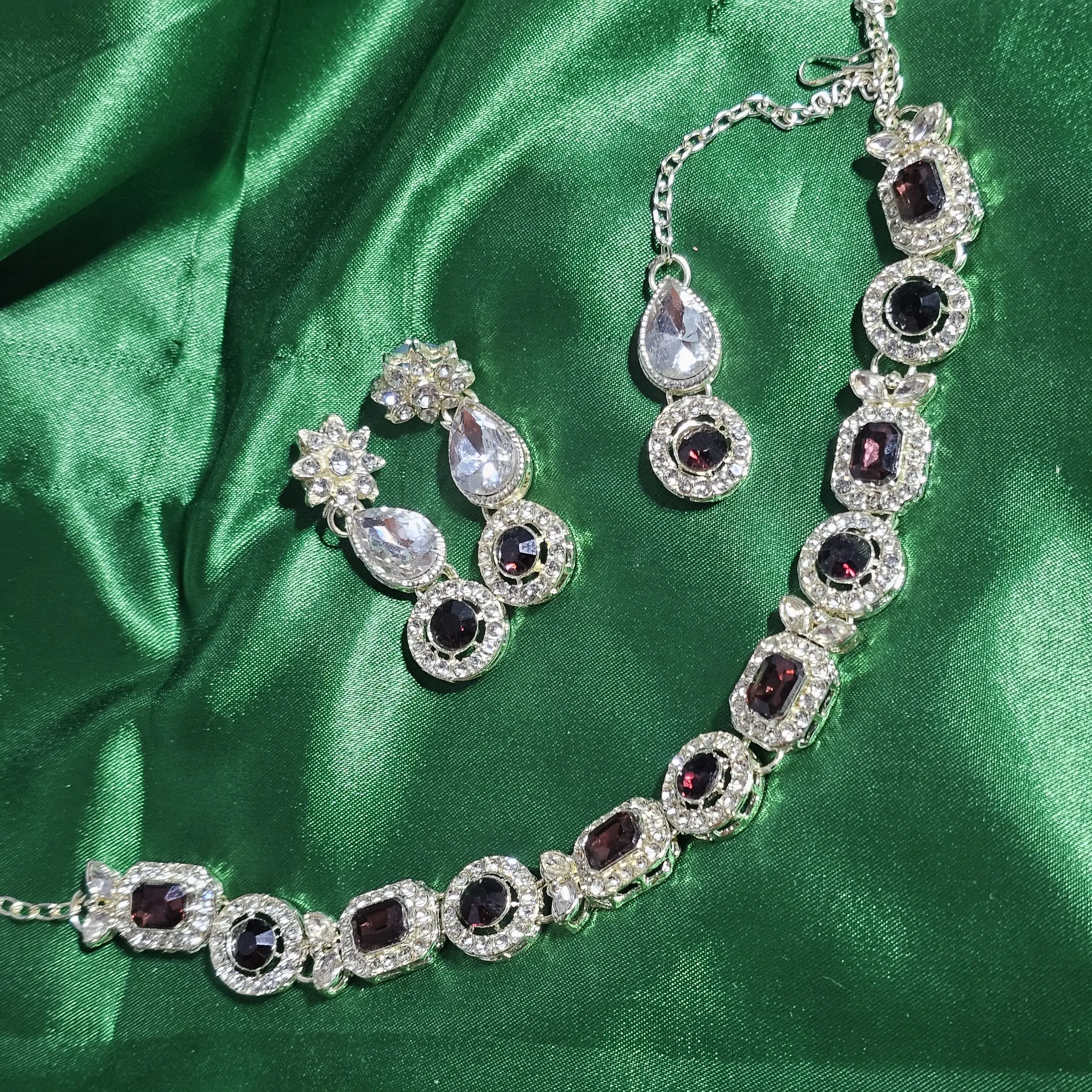 Add a bold touch of elegance to your jewellery collection with the Ruby Noir Crystal Necklace Set. Designed with deep maroon ruby-tone stones surrounded by dazzling white crystals, this necklace set delivers a rich and sophisticated appeal.